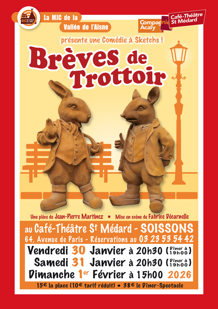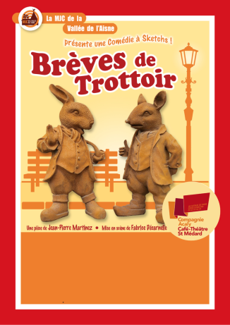 "Sur le trottoir d’une rue se jouent d’étranges histoires... Venez découvrir la MJC de la Vallée de l’Aisne dans une comédie à sketchs de Jean-Pierre Martinez !”