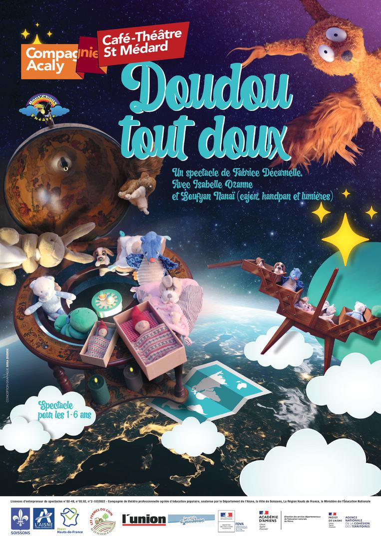 "Plongez dans le monde des doudous si chers à nos chérubins… Les doudous prennent vie devant les yeux des enfants et se mettent à raconter de jolies histoires… Mais quand un doudou est perdu, c’est l’alarme qui retentit. Vite ! Il faut absolument le retrouver ! Tout le monde mène l’enquête ! Mais rassurez-vous, tout est bien, qui finit bien…"